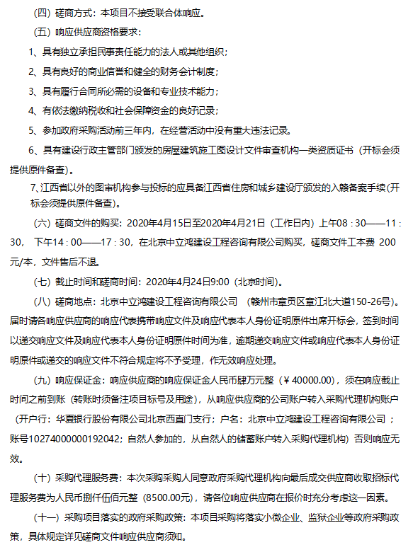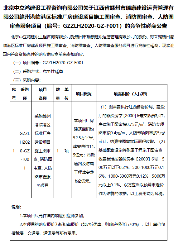 北京中立鸿建设工程咨询有限公司关于江西省赣州市瑞康建设运营管理有限公司赣州港临港区标准厂房建设项目图审服务项目的竞争性磋商公告