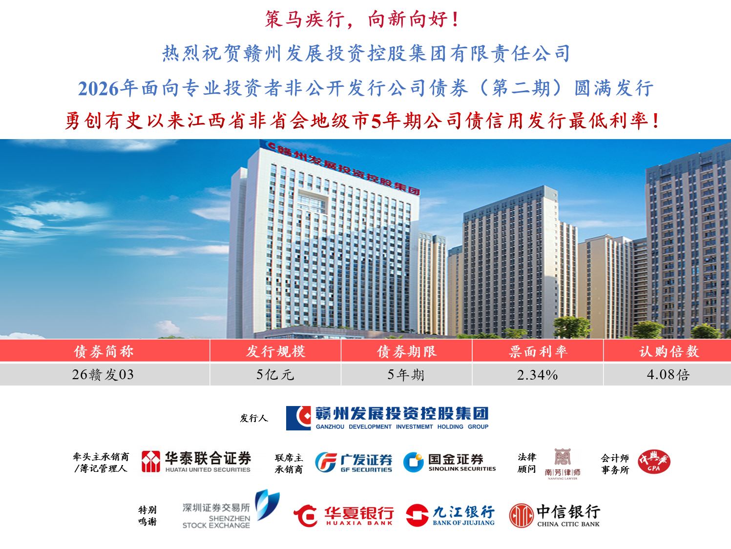 本次债券发行由华泰联合证券担任牵头主承销商及簿记管理人,广发证券、国金证券担任联席主承销商,得到了深圳证券交易所、华夏银行、九江银行、中信银行等机构的大力支持。在市场环境复杂多变的背景下,本次发行仍获得了专业投资者的踊跃认购,充分体现了资本市场对球盟会集团作为赣州市属核心骨干国企的信任与青睐,也为集团优化债务结构、降低融资成本、保障重点项目建设提供了坚实的资金支撑。